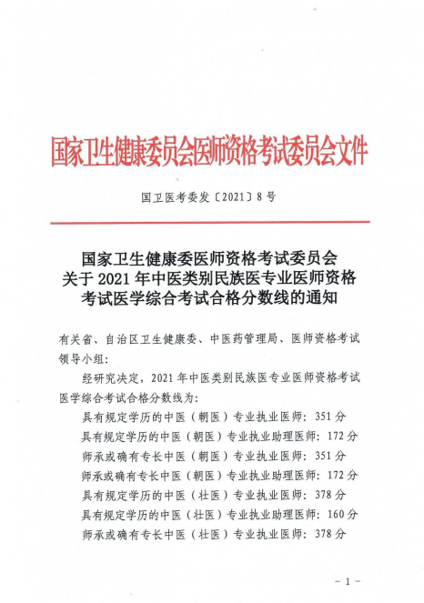 关于2021年中医类别民族医专业医师资格考试医学综合考试合格分数线的通知