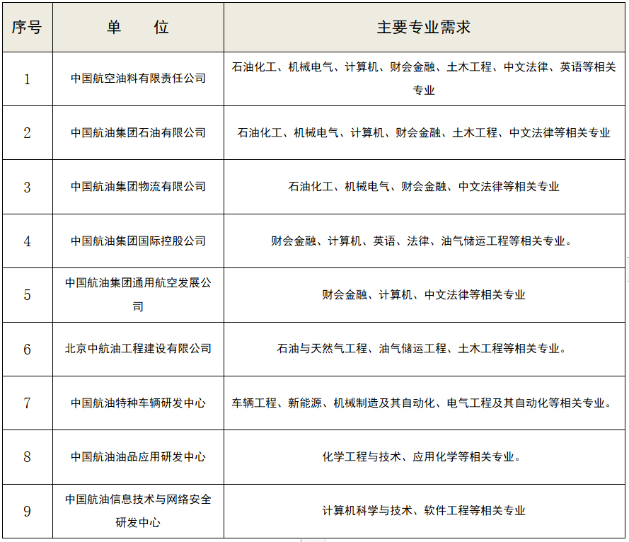 安全管理、企业管理、法律事务、文秘等综合管培生(专业见基本条件),油品应用、车辆技术、工程建设等技术研发岗或专业技术岗等,实习期一年(含半年试用期),用人单位如下: