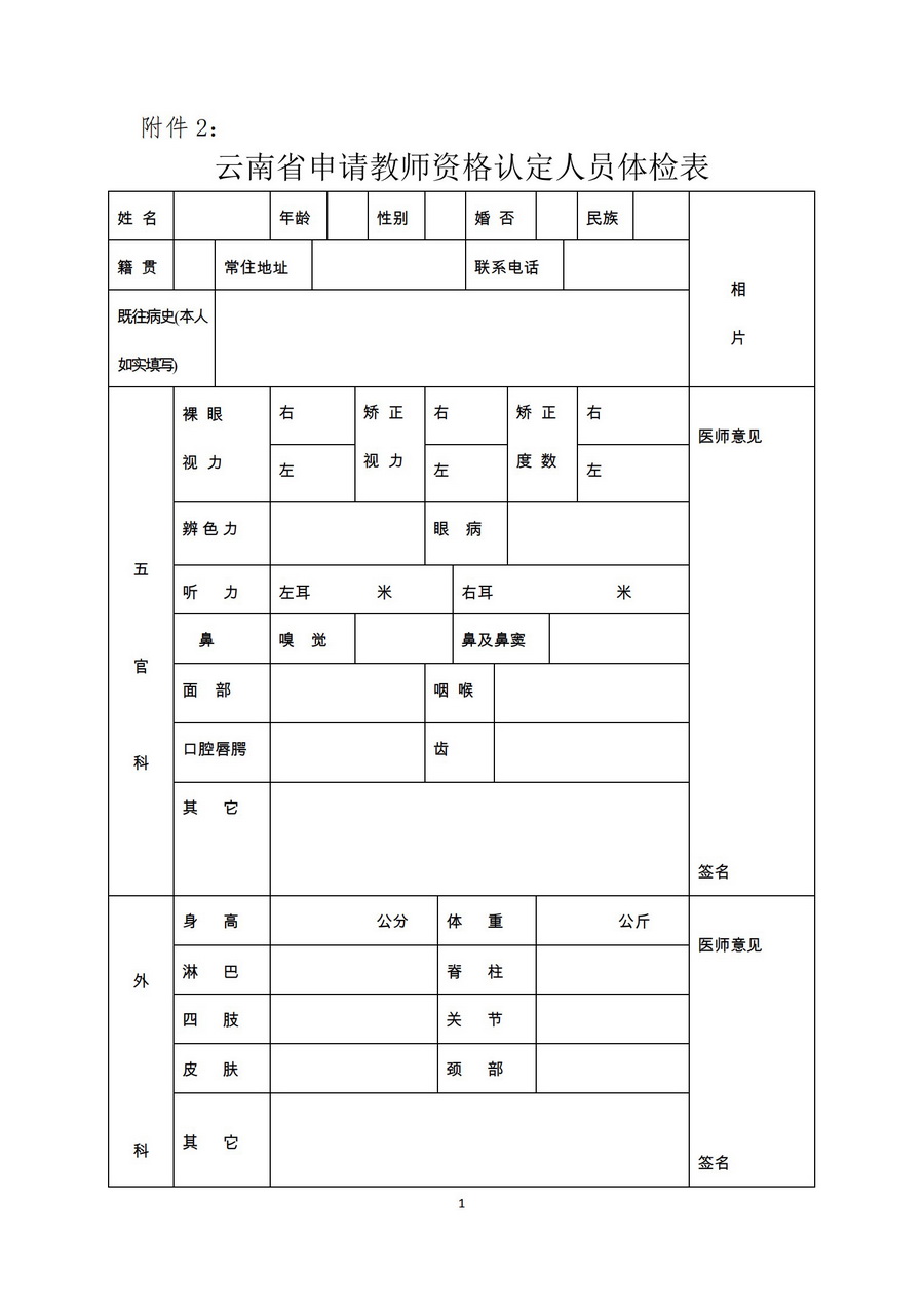 提供《云南省申请教师资格认定人员体检表》原件(见附件2),也可从中国教师资格网(https://www.jszg.edu.cn下载),体检报告仅限当次认定有效。
