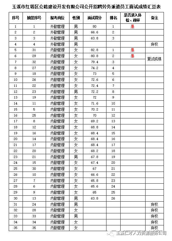 根据《玉溪市红塔区公路建设开发有限公司公开招聘劳务派遣员工公告》,通过资格初审,报名人数共35名(项目现场管理4名,项目内勤管理31名)。2023年12月18日上午9:00进行面试,实际参加面试人数29名(项目现场管理弃权1名,项目内勤管理弃权5名)。经过面试,成绩经全程监督、现场打分确定,现将面试成绩予以公示。并根据《玉溪市红塔区公路建设开发有限公司公开招聘劳务派遣员工公告》,将进入下一环节--体检政审人员名单进行公示,公示期共3天,自2023年12月20日至12月22日。公示期间如有问题、意见、建议,请在上述规定时间内(上午8:30-11:30,下午14:30-17:30)致电:19987714651(尹老师)。