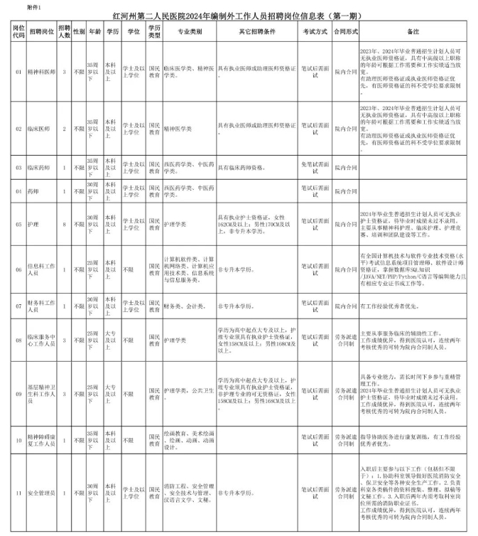 1.红河州第二人民医院2024年编制外工作人员招聘岗位信息表.xls