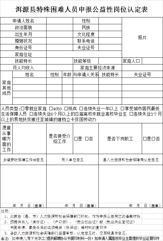 (三)报名须携带的材料:公益性岗位申请书(自行准备),《洱源县公益性岗位申报表》(详见附件1),身份证复印件,户口册复印件,《就业创业证》复印件,其中:双失业人员须提供夫妻双方《结婚证》、《身份证》和《就业创业证》复印件;残疾人提供《残疾证》原件、复印件;低保人员提供《低保领取证》原件、复印件;高校毕业生提供毕业证原件、复印件;完全失去土地人员提供村及乡镇出具的相关文件或证明。
