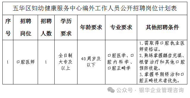 为进一步满足五华区妇幼健康服务中心工作开展需要,按照公开、平等、竞争、择优的原则,委托云南银华企业管理咨询有限责任公司(以下简称公司),面向社会公开招聘编外口腔医师1名,现将招聘有关事项公告如下: