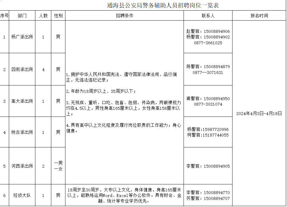 根据工作需要,通海县公安局面向社会公开招聘警务辅助人员10名,现将有关事项公告如下: