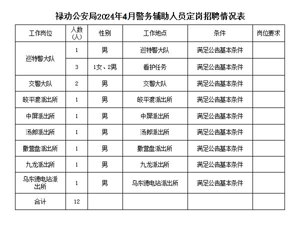 本次招聘为劳务派遣用工性质,共招聘12人,实行劳动合同制管理,岗位为禄劝彝族苗族自治县公安局勤务辅警,不纳入编制管理,不具有人民警察身份,不行使人民警察职权,主要负责协助公安民警开展治安巡逻、应急处突、非涉密性行政事务和公共服务管理等工作。具体招聘岗位需求见附件1《禄劝彝族苗族自治县公安局2024年4月警务辅助人员定岗招聘情况表》。