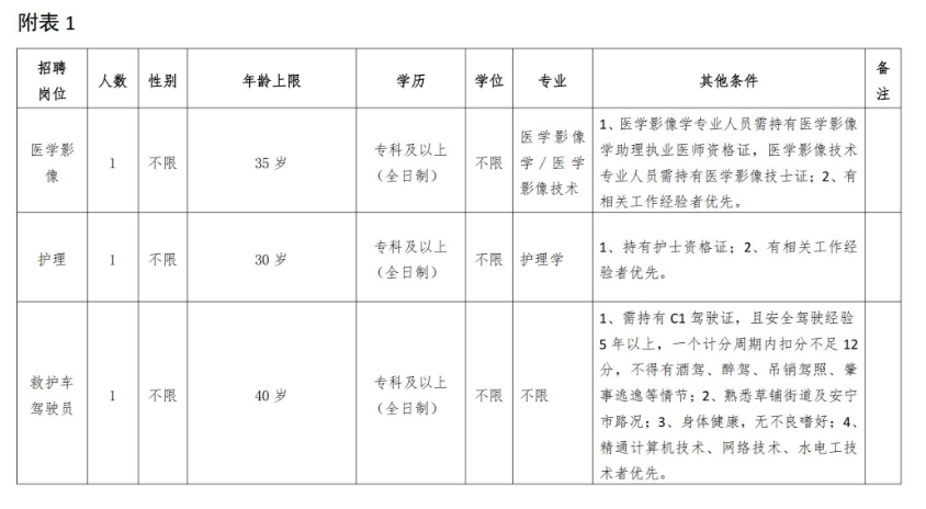 本次招聘医学影像、护理、救护车驾驶员(含水电后勤)3个岗位,待遇按6000元/月(含社保)。