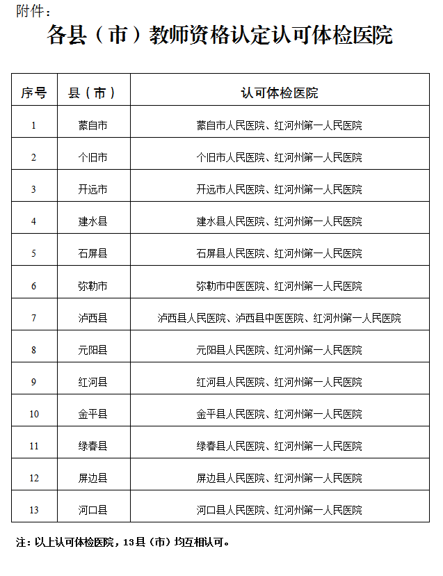 (4)由红河州第一人民医院、蒙自市人民医院任意一家医院出具的体格检查证明及相关检查报告原件,体检表请到以上医院领取。(体检表粘贴的相片与网络报名的相片为同一张;体检时告知医院是教师资格认定体检;申请幼儿园教师资格请跟医院说明;体检报告仅限当次认定有效。)