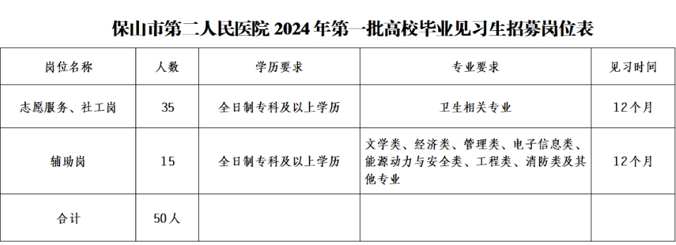 本次招募岗位为保山市第二人民医院2024年第一批次高校毕业见习生,招募人数50人,岗位具体要求详见《保山市第二人民医院2024年第一批见习生岗位表》。