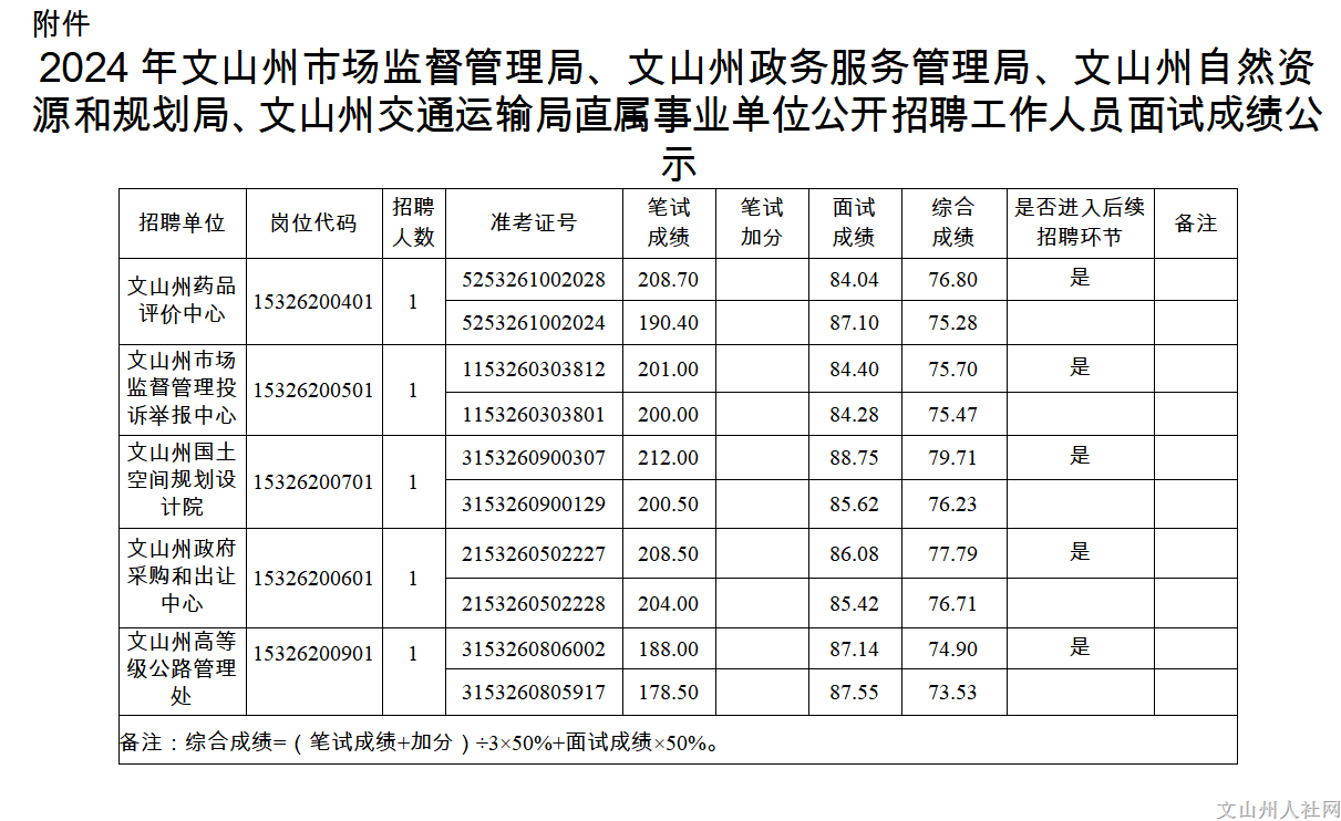 根据《2024年文山州事业单位公开招聘工作人员通告》《文山州市场监督管理局、文山州政务服务管理局、文山州自然资源和规划局、文山州交通运输局2024年事业单位公开招聘工作人员面试通告》等相关规定,文山州市场监督管理局、文山州政务服务管理局、文山州自然资源和规划局、文山州交通运输局直属事业单位公开招聘已于5月25日组织开展面试工作。现将面试成绩、综合成绩及进入后续招聘环节人员名单公示如下(名单详见附件)。
