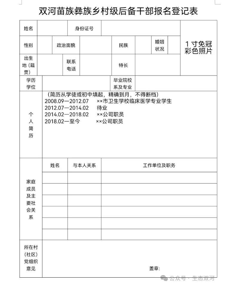 附:《双河苗族彝族乡村级后备干部报名登记表》