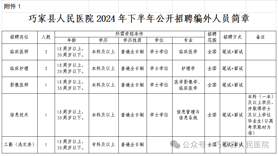 (一)岗位设置:详见附件《巧家县人民医院2024年下半年公开招聘编外人员简章》。