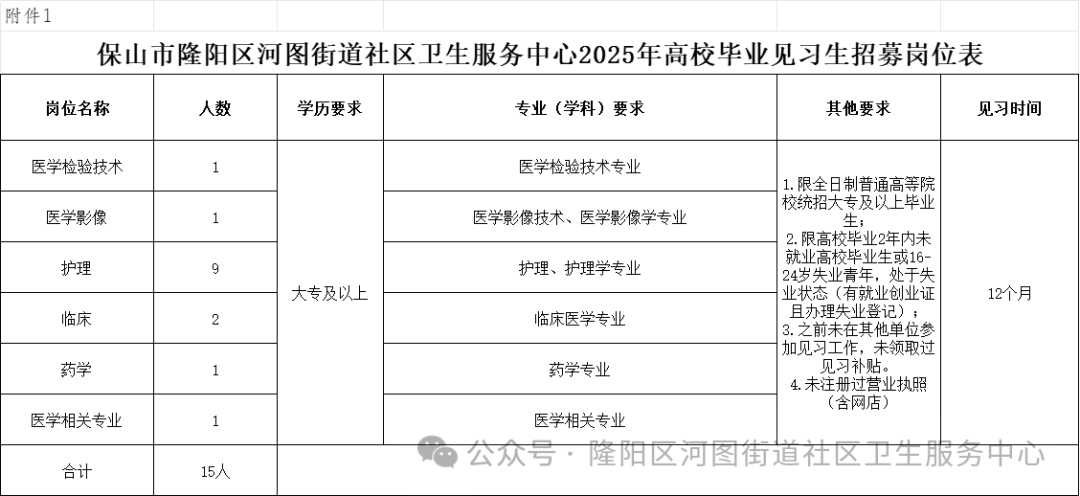 本次招募岗位为保山市隆阳区河图街道社区卫生服务中心2025年高校毕业见习生,招募人数15人,岗位具体要求详见《保山市隆阳区河图街道社区卫生服务中心2025年招募见习人员岗位设置表》。