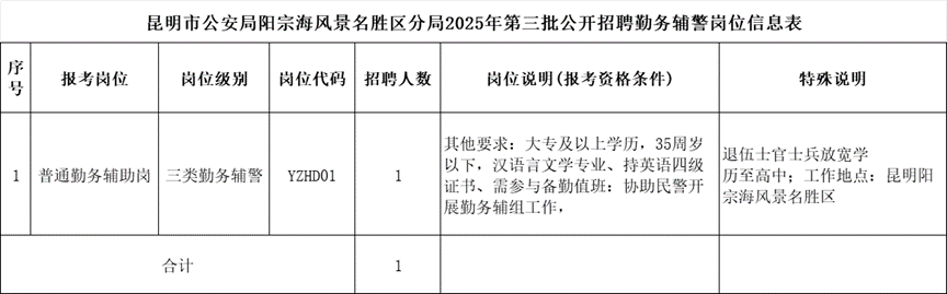 本次共招聘1人,岗位为“三类勤务辅警”,性别不限,详见岗位信息表: