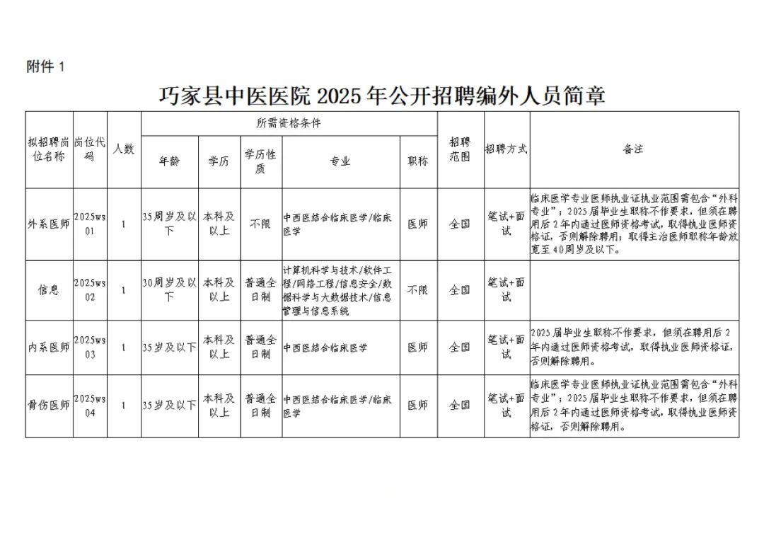 附件:1.巧家县中医医院2025年公开招聘编外人员简章