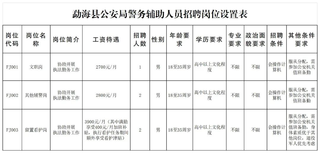 本次共招聘辅警5人,主要在勐海县公安局内设机构从事执法勤务等工作。辅警不具有人民警察和公务员身份,不行使人民警察职权。具体岗位见《勐海县公安局警务辅助人员招聘岗位设置表》