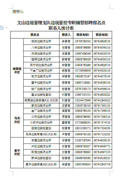 1.麻栗坡片区:应聘人员可以到麻栗坡边境管理大队部或所辖就近的董干、铁厂、杨万、八布、猛硐、天保、下金厂、城关、茨竹坝边境派出所,董占边境检查站进行现场报名。