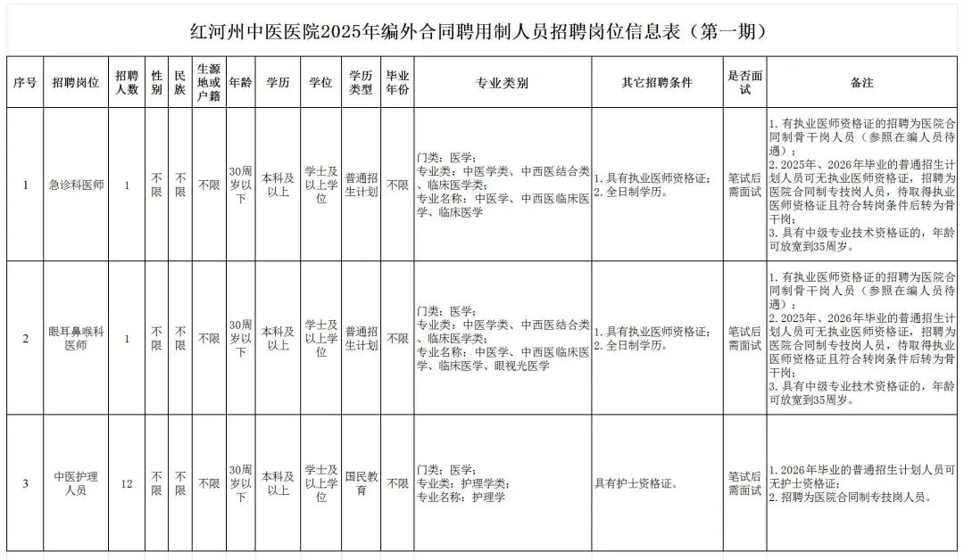 红河州中医医院2025年编外合同聘用制人员招聘公告(第一期)