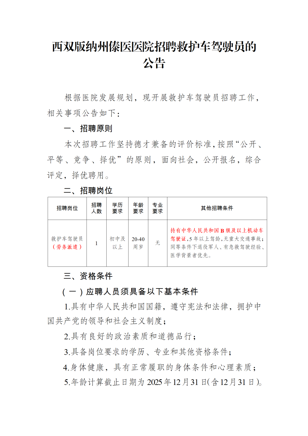 2025年西双版纳州傣医医院招聘救护车驾驶员公告