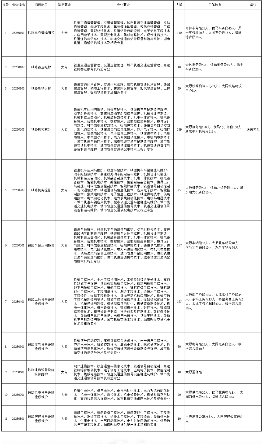 中国铁路太原局集团有限公司2026年招聘高校毕业生岗位信息表