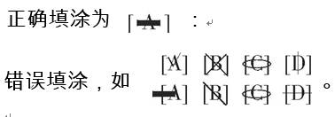 ●必须按照正确填涂要求进行填涂,以保证涂点面积达到规定要求使计算机能正确识别。填涂面积过小,或过于偏斜,均导致计算机不能正确识别。比如与下面错误填涂示例相类似的填涂都是错误的;