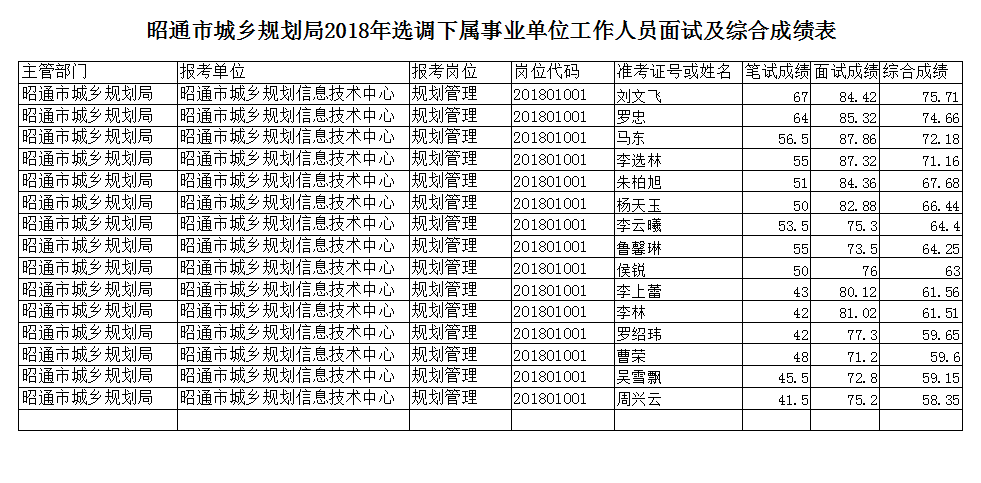 昭通市城乡规划局2018年选调下属事业单位人员面试及综合成绩表