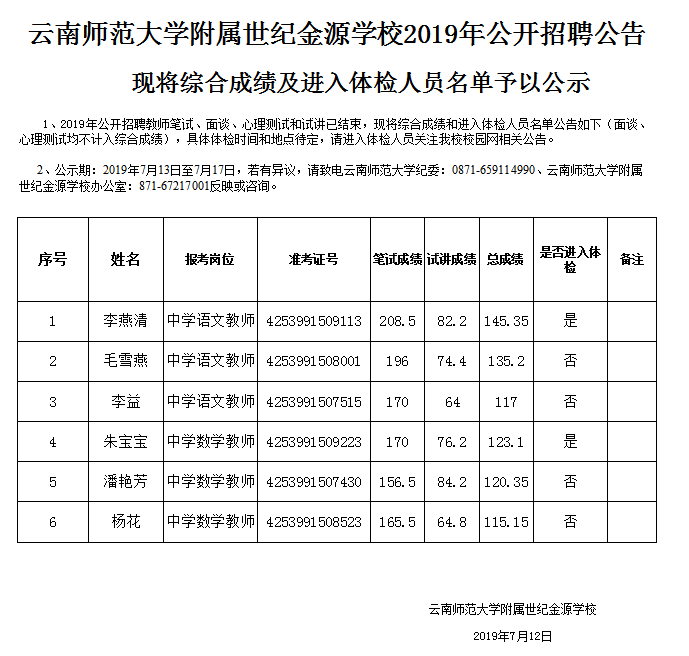 云南师范大学附属世纪金源学校2019年公开招聘公告 现将综合成绩及进入体检人员名单予以公示