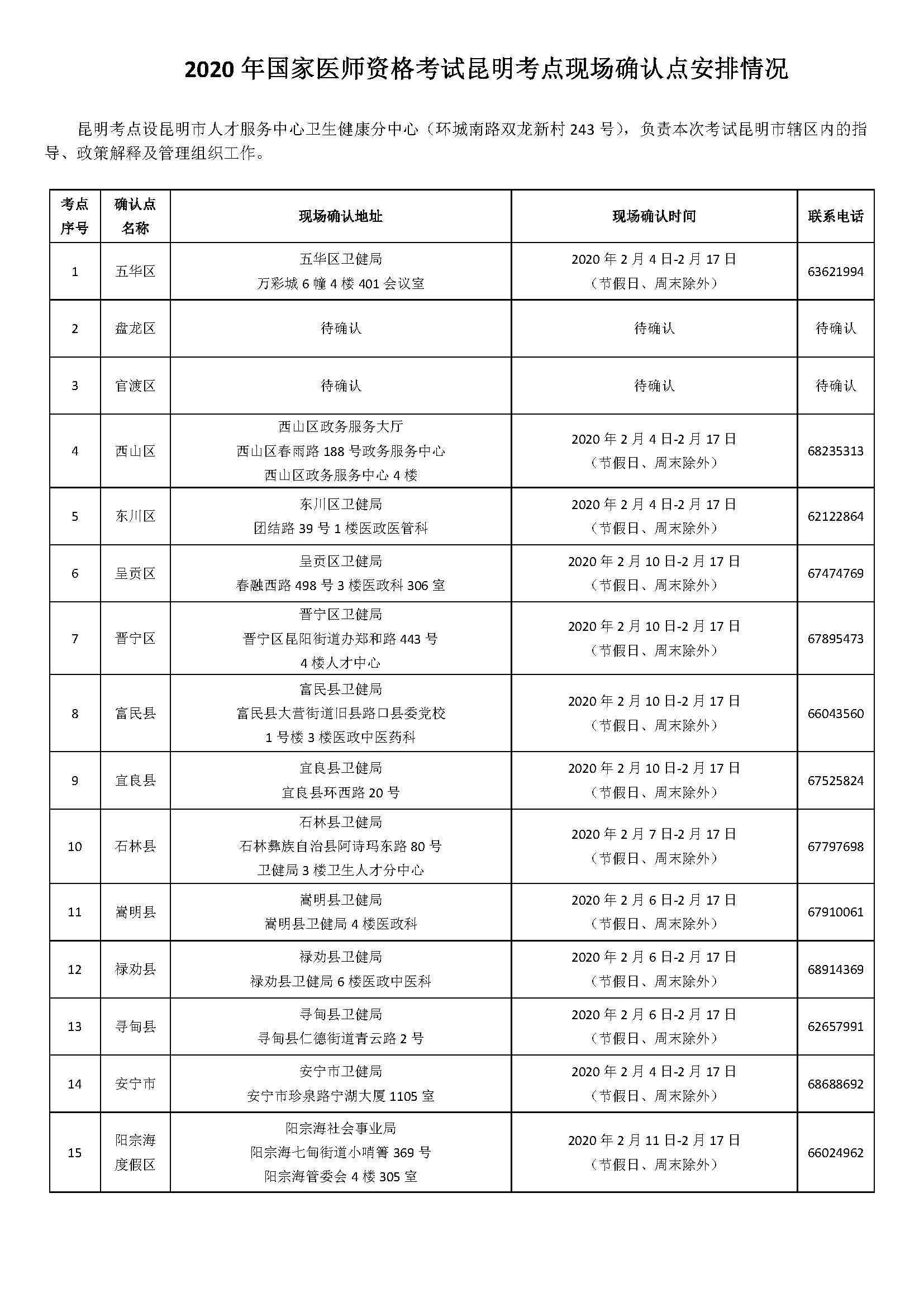 2020年度医师资格考试昆明考点现场确认点安排通告