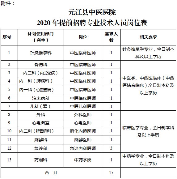 元江县中医医院2020年提前招聘编制内工作人员公告
