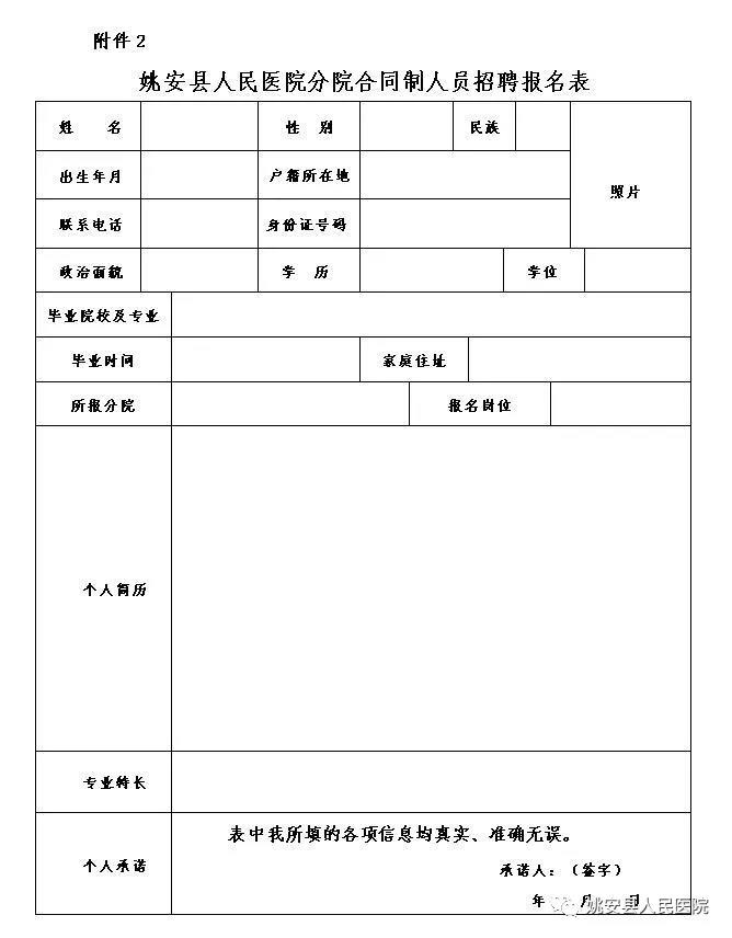 2、《姚安县人民医院分院合同制人员招聘报名表》