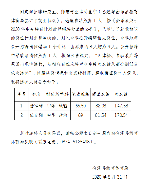 会泽县2020年中央特岗计划教师招聘递补人员公示(一)