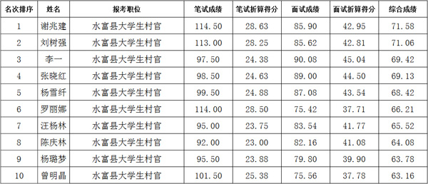 根据昭通市委组织部《关于做好2014年大学生村官选聘面试等有关工作的通知》(昭组电明〔2014〕10号)文件精神,现将水富县2014年大学生村官选聘综合成绩予以公告。